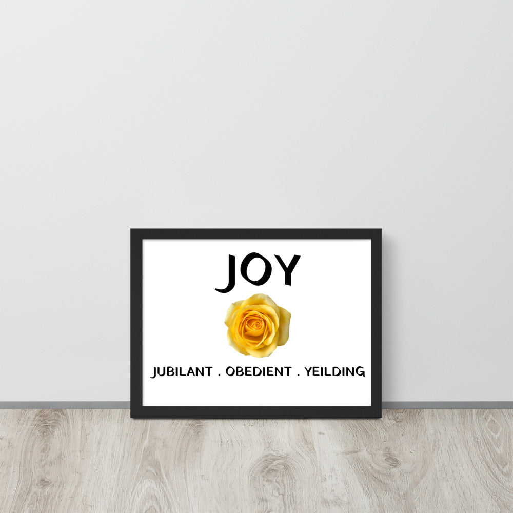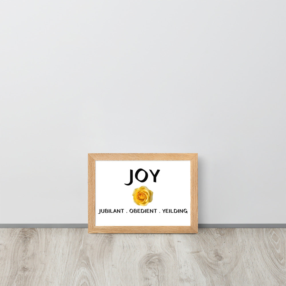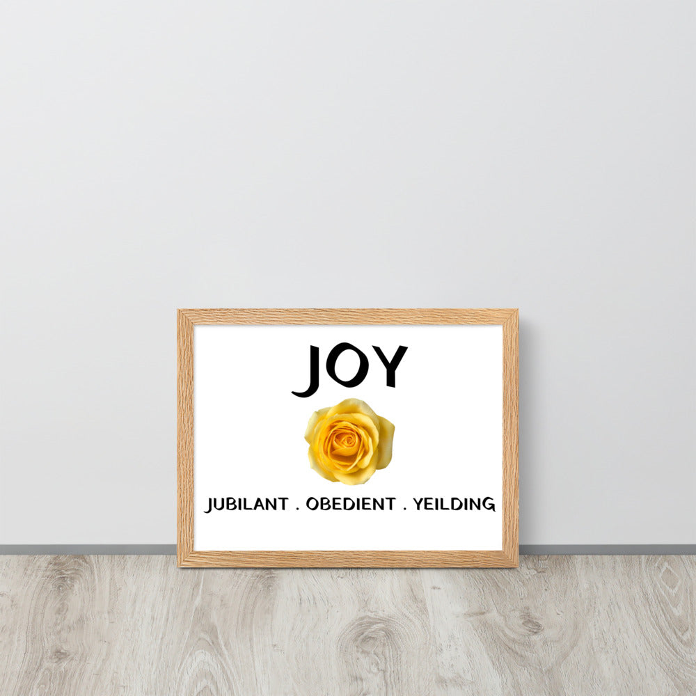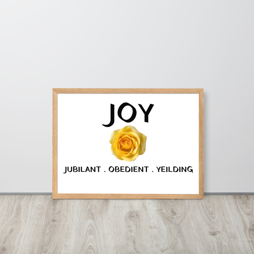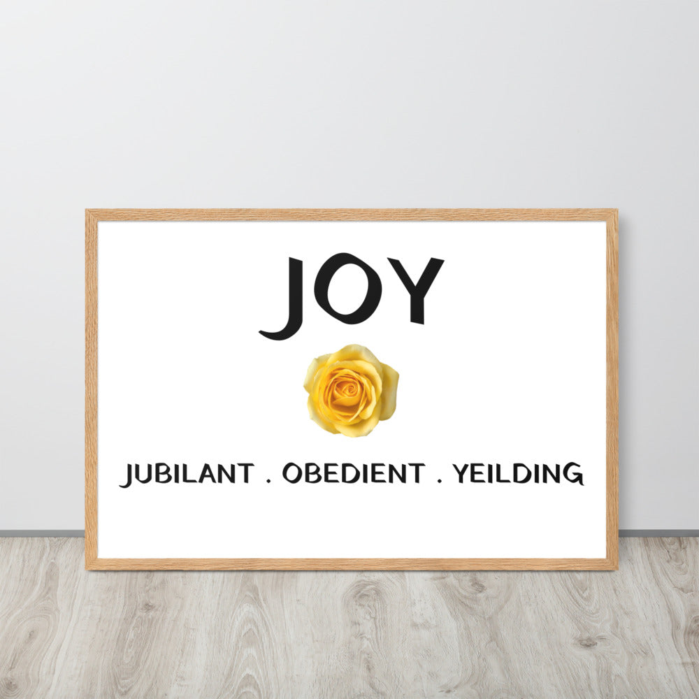 JOY Framed Matte Paper Poster Add a bold statement piece to any room with this framed poster. Printed on quality, thick, matte paper. • Paper weight: 189 g/m² (5.57 oz/y²) • 0.26 mm (10.3 mil) thick • Black and white frame made from semi-hardwood alder • Oak frame made from...
