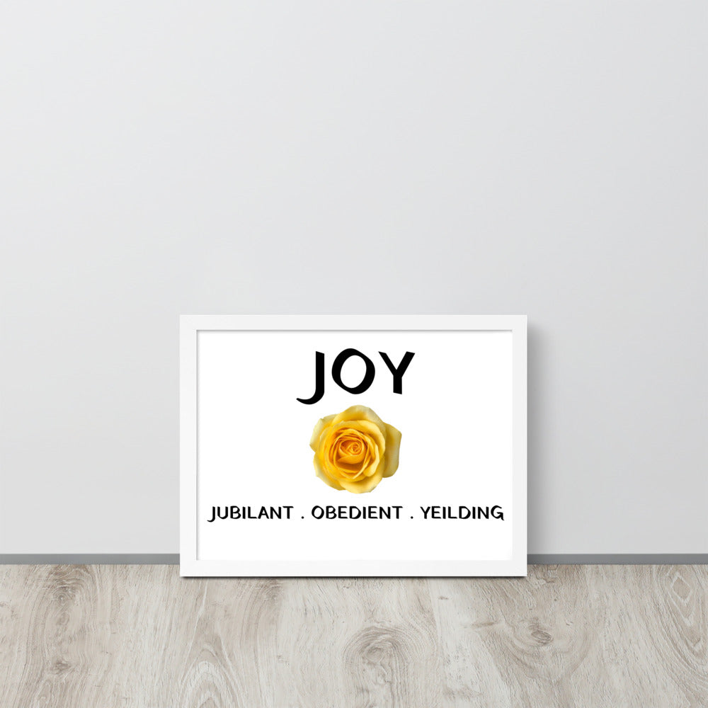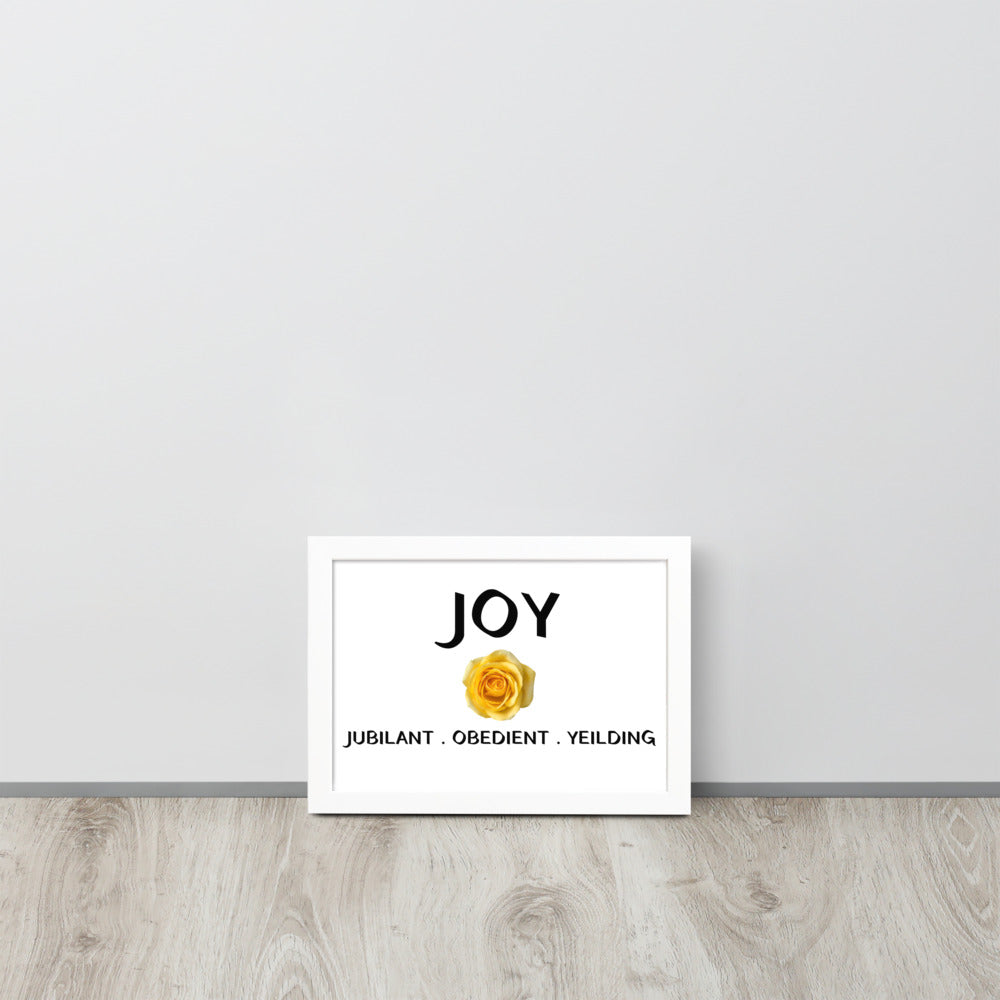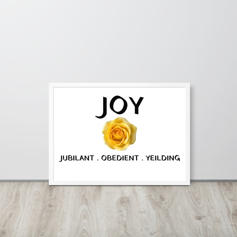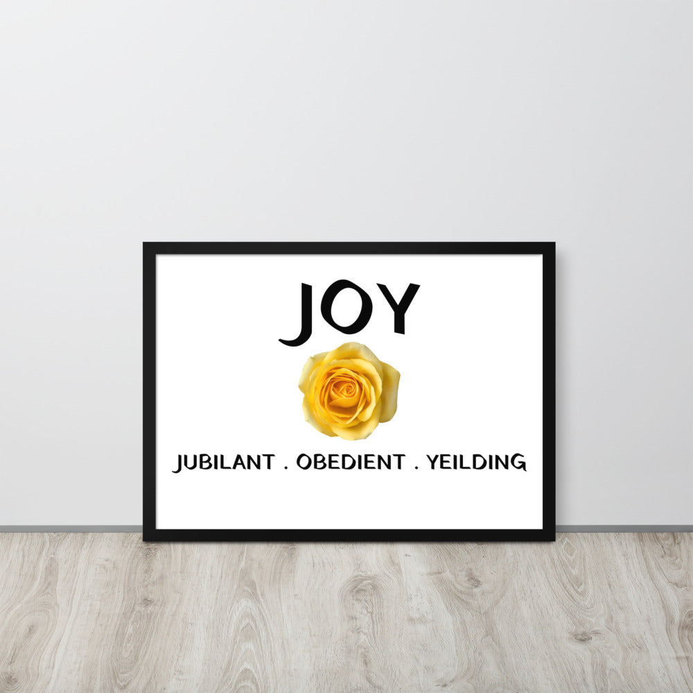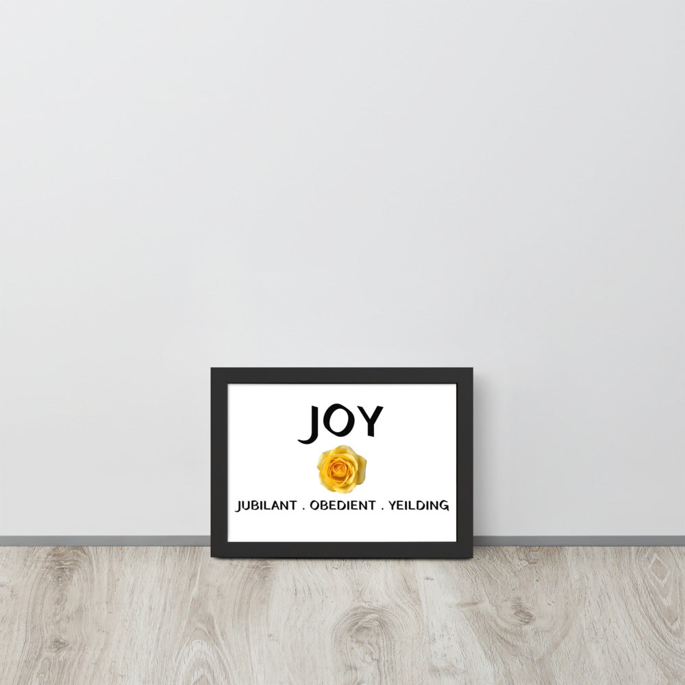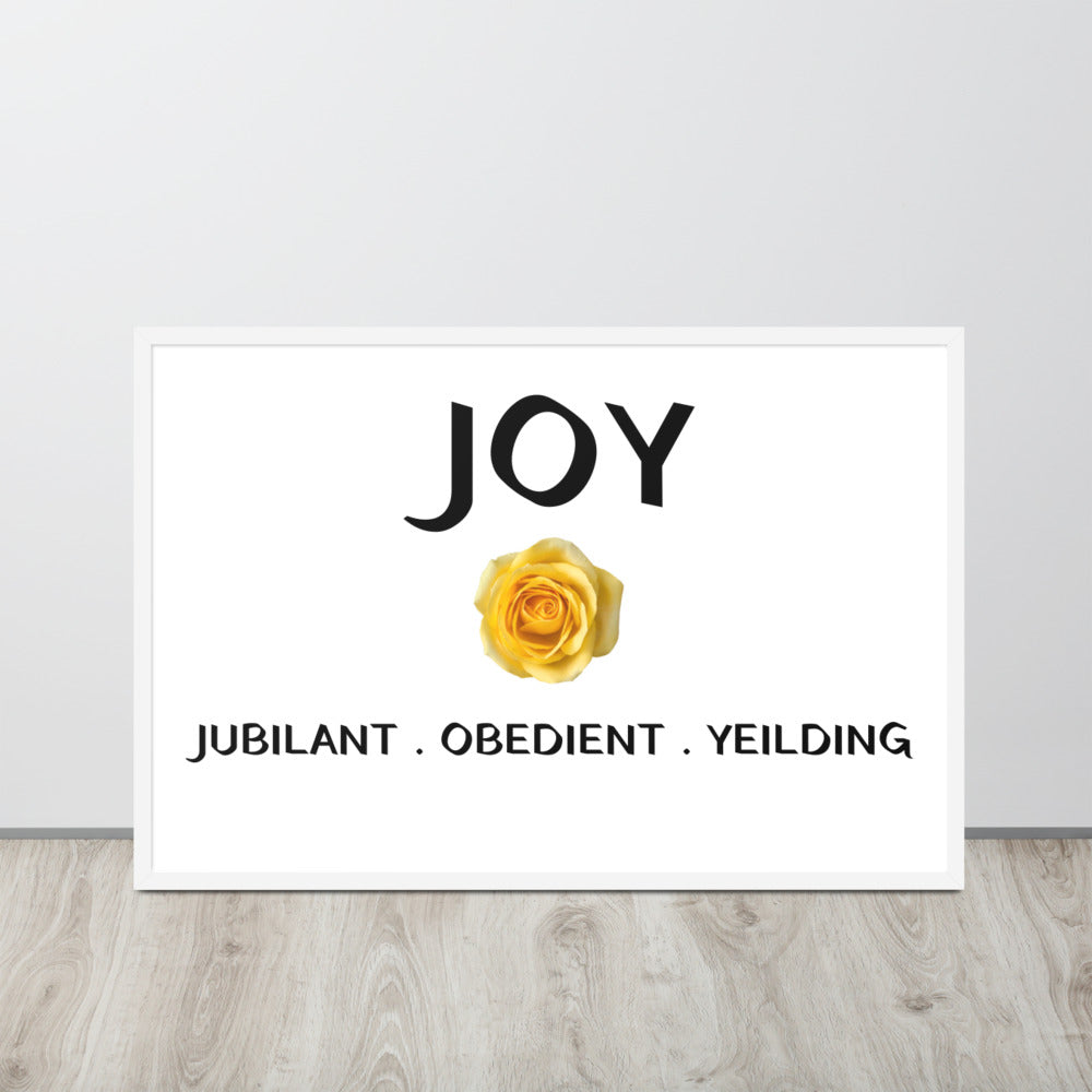 JOY Framed Matte Paper Poster Add a bold statement piece to any room with this framed poster. Printed on quality, thick, matte paper. • Paper weight: 189 g/m² (5.57 oz/y²) • 0.26 mm (10.3 mil) thick • Black and white frame made from semi-hardwood alder • Oak frame made from...