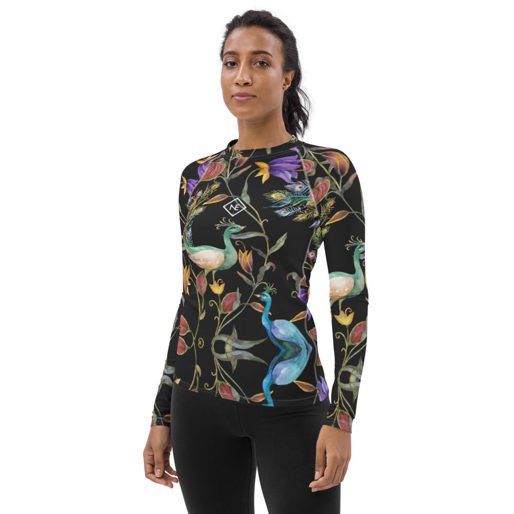 Women's Peacock Feather Print Rash Guard Don't be afraid to be your most active self in this smooth and versatile long-sleeve rash guard! It protects you from the sun, wind, and other elements while doing sports, and the slim fit, flat ergonomic seams, and the longer body gives extra comfort....